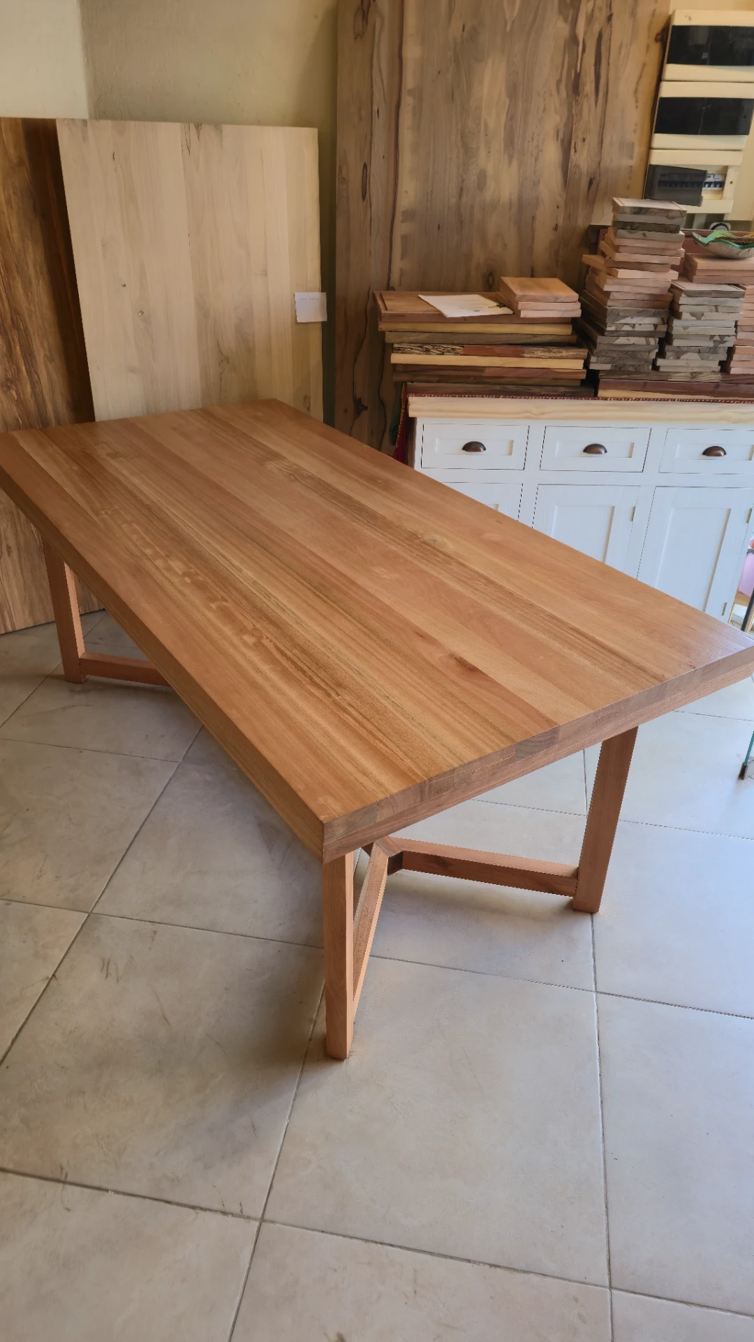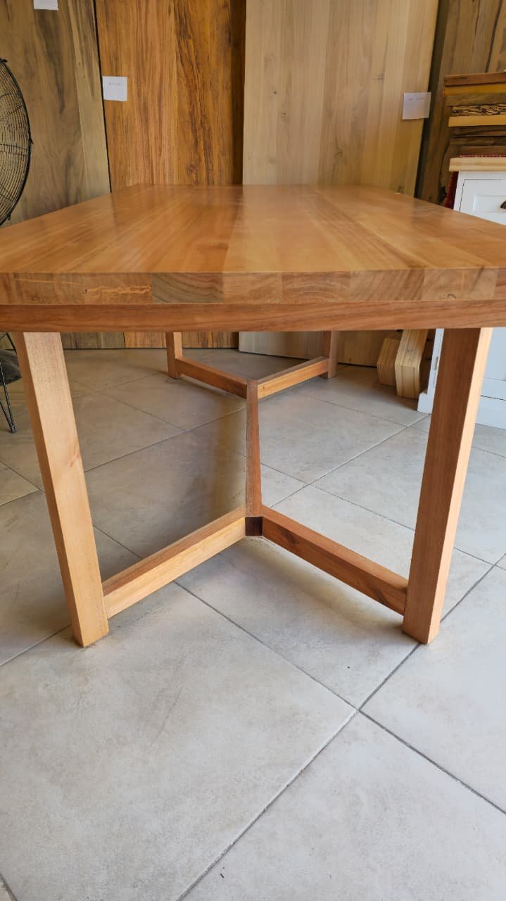Cada mesa está elaborada con madera secada a horno, lo que garantiza mayor estabilidad y resistencia a lo largo del tiempo. La terminación con laca poliuretánica de alto tránsito protege la superficie y resalta la belleza natural de la madera.